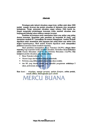 Persaingan pada industri reksadana sangat ketat, terlihat sejak tahun 2000 jumlah manajer investasi dan produk reksadana di Indonesia terus mengalami peningkatan. Tetapi, pemasaran reksadana sangat terbatas. Oleh karena itu, dengan mengetahui pertimbangan konsumen ketika membeli reksadana akan berpengaruh terhadap sukses tidaknya manajer investasi. Penelitian ini bertujuan untuk menentukan faktor atau atribut yang paling disukai konsumen. Responden pada penelitian ini berjumlah 30 orang, yang merupakan nasabah PT. Lautandhana Investment Management. Analisis Konjoin digunakan untuk menentukan nilai kegunaan dari setiap faktor atau atribut serta tingkat kepentingannya. Hasil analisis Konjoin digunakan untuk memprediksi preferensi konsumen dalam membeli reksadana. Hasil penelitian menunjukkan Biaya Transaksi (26,59%) sebagai faktor terpenting bagi responden ketika membeli reksadana. Kemudian faktor berikutnya adalah Ukuran Reksadana (20,67%) dan Performa Reksadana (12,27%). Dan komposisi produk reksadana yang disukai adalah : • Biaya Transaksi sebesar 2%, • Ukuran Large dan berafiliasi dengan pemerintah, • Performa yang dilihat adalah selama lima tahun terakhir, • dan MI yang disukai adalah yang memiliki pengalaman setidaknya 5 tahun, profesional, dan agresif. Kata kunci : reksadana, manajer investasi, analisis Konjoin, atribut produk, stimuli, utilitas, nilai kegunaan (part-worth)