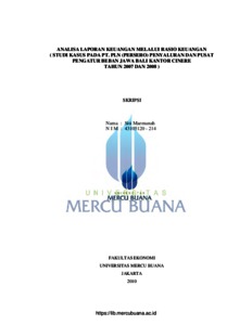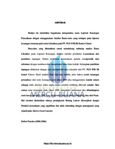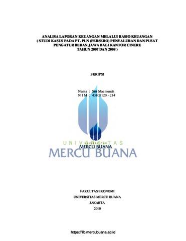 Maemunah, Siti (2010) ANALISA LAPORAN KEUANGAN MELALUI RASIO KEUANGAN ( STUDI KASUS PADA PT.PLN ( PERSERO ) PENYALURAN DAN PUSAT PENGATUR BEBAN JAWA BALI KANTOR CINERE TAHUN 2007 DAN 2008. S1 thesis, Universitas Mercu Buana.