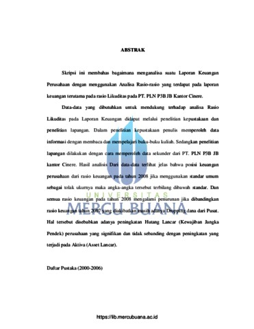 Skripsi ini membahas bagaimana menganalisa suatu Laporan Keuangan Perusahaan dengan menggunakan Analisa Rasio-rasio yang terdapat pada laporan keuangan terutama pada rasio Likuditas pada PT. PLN P3B JB Kantor Cinere. Data-data yang dibutuhkan untuk mendukung terhadap analisa Rasio Likuditas pada Laporan Keuangan didapat melalui penelitian kepustakaan dan penelitian lapangan. Dalam penelitian kepustakaan penulis memperoleh data informasi dengan membaca dan mempelajari buku-buku kuliah. Sedangkan penelitian lapangan dilakukan dengan cara memperoleh data sekunder dari PT. PLN P3B JB kantor Cinere. Hasil analisis Dari data-data terlihat jelas bahwa posisi keuangan perusahaan dari rasio keuangan pada tahun 2008 jika menggunakan standar umum sebagai tolak ukurnya maka angka-angka tersebut terbilang dibawah standar. Dan semua rasio keuangan pada tahun 2008 mengalami penurunan jika dibandingkan rasio keuangan tahun 2007 yang diakibatkan masih adanya Dropping dana dari Pusat. Hal tersebut disebabkan adanya peningkatan Hutang Lancar (Kewajiban Jangka Pendek) perusahaan yang signifikan dan tidak sebanding dengan peningkatan yang terjadi pada Aktiva (Asset Lancar). Daftar Pustaka (2000-2006)