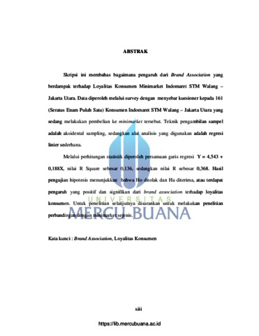 Skripsi ini membahas bagaimana pengaruh dari Brand Association yang berdampak terhadap Loyalitas Konsumen Minimarket Indomaret STM Walang – Jakarta Utara. Data diperoleh melalui survey dengan menyebar kuesioner kepada 161 (Seratus Enam Puluh Satu) Konsumen Indomaret STM Walang – Jakarta Utara yang sedang melakukan pembelian ke minimarket tersebut. Teknik pengambilan sampel adalah aksidental sampling, sedangkan alat analisis yang digunakan adalah regresi linier sederhana. Melalui perhitungan statistik diperoleh persamaan garis regresi Y = 4,543 + 0,188X, nilai R Square sebesar 0,136, sedangkan nilai R sebesar 0,368. Hasil pengujian hipotesis menunjukkan bahwa Ho ditolak dan Ha diterima, atau terdapat pengaruh yang positif dan signifikan dari brand association terhadap loyalitas konsumen. Untuk penelitian selanjutnya disarankan untuk melakukan penelitian perbandingan dengan minimarket sejenis. Kata kunci : Brand Association, Loyalitas Konsumen