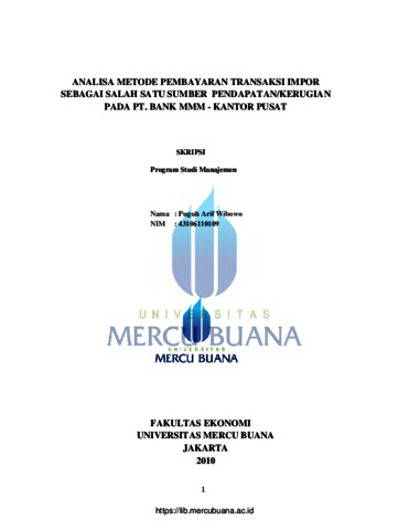 Wibowo, Puguh Arif (2010) ANALISA METODE PEMBAYARAN TRANSAKSI IMPOR SEBAGAI SALAH SATU SUMBER PENDAPATAN/KERUGIAN PADA PT. BANK MMM-KANTOR PUSAT. S1 thesis, Universitas Mercu Buana.