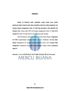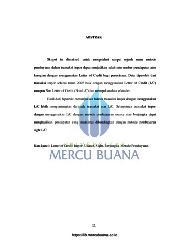 Skripsi ini dimaksud untuk mengetahui sampai sejauh mana metode pembayaran dalam transaksi impor dapat menjadikan salah satu sumber pendapatan atau kerugian dengan menggunakan Letter of Credit bagi perusahaan. Data diperoleh dari transaksi impor selama tahun 2007 baik dengan menggunakan Letter of Credit (L/C) maupun Non Letter of Credit (Non L/C) dan merupakan data sekunder. Hasil dari hipotesis menunjukkan bahwa transaksi impor dengan menggunakan L/C lebih menguntungkan daripada transaksi non L/C. Selanjutnya transaksi impor dengan menggunakan L/C dengan metode pembayaran usance atau berjangka dapat menghasilkan pendapatan yang maksimal dibandingkan dengan metode pembayaran sight L/C. Kata kunci : Letter of Credit, Impor, Usance, Sight, Berjangka, Metode Pembayaran.