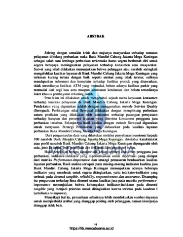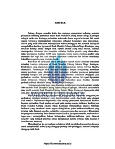 Seiring dengan semakin kritis dan majunya masyarakat terhadap tuntutan pelayanan dibidang perbankan maka Bank Mandiri Cabang Jakarta Mega Kuningan sebagai salah satu lembaga perbankan terkemuka harus segera berbenah diri untuk segera berupaya meningkatkan pelayanan terhadap konsumen atau masyarakat. Survei yang telah dilakukan menunjukkan bahwa pelanggan atau nasabah seringkali mengeluhkan kualitas layanan di Bank Mandiri Cabang Jakarta Mega Kuningan yang terkesan kurang tertata dengan baik seperti antrian yang tidak teratur, sulitnya mendapatkan informasi dan komplain terhadap fasilitas produk yang ditawarkan, tidak tersedianya fasilitas ATM yang memadai, belum adanya fasilitas parkir yang memadai dari segi luas area maupun keamanan kendaraan dan belum tersedianya loket khusus pembayaran rekening listrik. Penelitian ini dilakukan untuk mengetahui sejauh mana kepuasan konsumen terhadap kualitas pelayanan di Bank Mandiri Cabang Jakarta Mega Kuningan. Pendekatan yang digunakan adalah dengan menggunakan metode Service Quality (Servqual). Perhitungan nilai Servqual dilakukan dengan menghitung perbedaan antara penilaian yang dilakukan oleh konsumen terhadap pasangan pernyataan terhadap harapan dan persepsi layanan yang diterima konsumen pengguna jasa perbankan tersebut. Selanjutnya hasil analisa dengan metode Servqual digunakan untuk menyusun Strategi Pemasaran yang didasarkan pada kualitas layanan perbankan Bank Mandiri Cabang Jakarta Mega Kuningan. Dari pengumpulan data yang dilakukan melalui penyebaran kuesioner kepada 100 nasabah Bank Mandiri Cabang Jakarta Mega Kuningan, diketahui karakteristik atau profil nasabah Bank Mandiri Cabang Jakarta Mega Kuningan dipengaruhi oleh usia, jenis kelamin, jenis pekerjaan dan frekuensi kunjungan per bulan. Hasil penelitian berupa karakteristik setiap segmen konsumen pengguna jasa perbankan, indikator-indikator yang diperioritaskan untuk diperbaiki yang didapat dari matriks Performance-Importance dan strategi pemasaran berdasarkan kualitas layanan perbankan. Hasil analisa servqual pada masing-masing indikator kualitas jasa Bank Mandiri Cabang Jakarta Mega Kuningan menunjukkan adanya beberapa indikator yang mendesak untuk segera ditingkatkan, yaitu indikator-indikator yang terletak pada dimensi tangible, reliability, responsiveness dan assurance. Disamping itu pengurutan terhadap lima dimensi utama kualitas jasa pada matriks performanceimportance menunjukkan bahwa kebanyakan indikator-indikator pada dimensi tangible yang menjadi prioritas untuk ditingkatkan karena terletak pada kuadran I (attributes to improve). Menyikapi hal itu, perusahaan sebaiknya lebih memfokuskan sumber dayanya untuk memperbaiki atribut yang dianggap penting oleh pelanggan, namun kinerjanya dianggap tidak baik.
