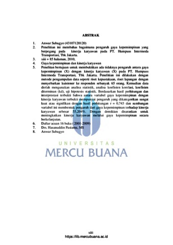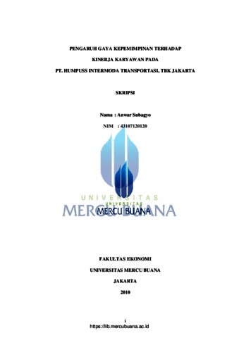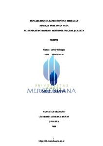 Subagyo, Anwar (2010) PENGARUH GAYA KEPEMIMPINAN TERHADAP KINERJA KARYAWAN PADA PT. HUMPUSS INTERMODA TRANSPORTASI, TBK JAKARTA. S1 thesis, Universitas Mercu Buana.