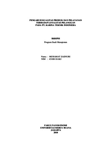 Zaenuri, Muhamat (2010) PENGARUH KUALITAS PRODUK DAN PELAYANAN TERHADAP LOYALITAS PELANGGAN PADA PT. KARINA TEKNIK INDONESIA. S1 thesis, Universitas Mercu Buana.