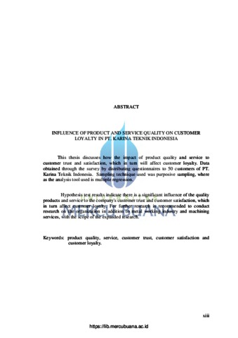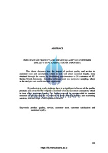 This thesis discusses how the impact of product quality and service to customer trust and satisfaction, which in turn will affect customer loyalty. Data obtained through the survey by distributing questionnaires to 50 customers of PT. Karina Teknik Indonesia. Sampling technique used was purposive sampling, where as the analysis tool used is multiple regression. Hypothesis test results indicate there is a significant influence of the quality products and service to the company's customer trust and customer satisfaction, which in turn affect customer loyalty. For further research is recommended to conduct research on the organization in addition to metal working industry and machining services, with the scope of the expanded research. Keywords: product quality, service, customer trust, customer satisfaction and custome