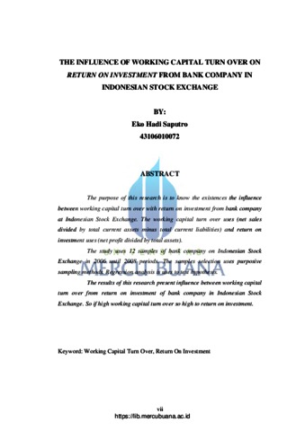 The purpose of this research is to know the existences the influence between working capital turn over with return on investment from bank company at Indonesian Stock Exchange. The working capital turn over uses (net sales divided by total current assets minus total current liabilities) and return on investment uses (net profit divided by total assets). The study uses 12 samples of bank company on Indonesian Stock Exchange in 2006 until 2008 periods. The samples selection uses purposive sampling methods. Regression analysis is uses to test hypothesis. The results of this research present influence between working capital turn over from return on investment of bank company in Indonesian Stock Exchange. So if high working capital turn over so high to return on investment. Keyword: Working Capital Turn Over, Return On Investment Penelitian ini bertujuan untuk mengetahui ada atau tidaknya pengaruh antara perputaran modal kerja terhadap return on investment pada perusahaan bank yang terdaftar di Burs Efek Indonesia. Perputaran modal kerja menggunakan (penjualan bersih dibagi dengan total aktiva lancar dikurangi total hutang lancar) dan return on investment menggunakan (laba bersih dibagi dengan total aktiva). Sampel yang digunakan dalam penelitian ini sebanyak 12 perusahaan bank yang terdaftar di Bursa Efek Indonesia pada periode 2006 sampai 2008. Sampel diseleksi menggunakan metode purposive sampling. Analisis regresi digunakan untuk menguji hipotesis. Hasil penilitian ini telah membuktikan bahwa adanya pengaruh perputaran modal kerja terhadap return on investment pada perusahaan bank yang terdaftar di Bursa Efek Indonesia. Hal ini berarti jika perputaran modal kerja tinggi maka return on investment juga tinggi. Kata Kunci:Perputaran Modal Kerja,Return On Investment