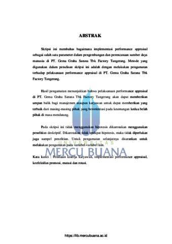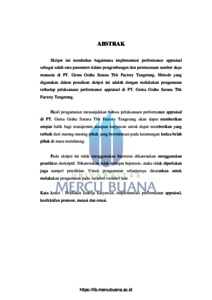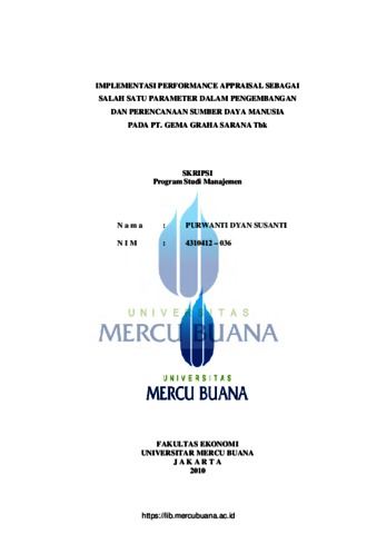 Susanti, Purwanti Dyan (2010) IMPLEMENTASI PERFORMANCE APPRAISAL SEBAGAI SALAH SATU PARAMENTER DALAM PENGEMBANGAN DAN PERENCANAAN SUMBER DAYA MANUSIA PADA PT. GEMA GRAHA SARANA TBK. S1 thesis, Universitas Mercu Buana.