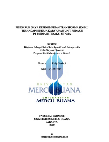 Satriadi, Rully (2010) PENGARUH GAYA KEPEMIMPINAN TRANFORMASIONAL TERHADAP KINERJA KARYAWAN REDAKSI PT. MEDIA INTERAKSI UTAMA. S1 thesis, Universitas Mercu Buana.