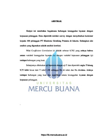 Skripsi ini membahas bagaimana hubungan keunggulan layanan dengan kepuasan pelanggan. Data diperoleh melalui survey dengan menyebarkan kuisioner kepada 100 pelanggan PT Kharisma Gemilang Pratama di Jakarta. Sedangkan alat analisis yang digunakan adalah analisis korelasi. Nilai Coefficient Correlation (r) adalah sebesar 0,702 yang artinya bahwa antara variabel keunggulan layanan (x) dengan variabel kepuasan pelanggan (y) terdapat hubungan yang kuat. Selanjutnya dilakukan uji hipotesis dengan uji T dan diperoleh angka T hitung 9,75 lebih besar dari T tabel 1,98 sehingga Ho di tolak dan Ha diterima. Artinya terdapat hubungan yang kuat dan signifikan antara keunggulan layanan dengan kepuasan pelanggan.