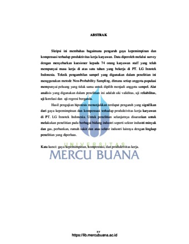 Skripsi ini membahas bagaimana pengaruh gaya kepemimpinan dan kompensasi terhadap produktivitas kerja karyawan. Data diperoleh melalui survey dengan menyebarkan kuesioner kepada 74 orang karyawan staff yang telah mempunyai masa kerja di atas satu tahun yang bekerja di PT. LG Innotek Indonesia. Teknik pengambilan sampel yang digunakan dalam penelitian ini menggunakan metode Non-Probability Sampling, dimana setiap anggota populasi mempunyai peluang yang tidak sama untuk dipilih menjadi anggota sampel. Alat analisis yang digunakan dalam penelitian ini adalah uki validitas, uji reliabilitas, uji korelasi dan uji regresi berganda. Hasil pengujian hipotesis menunjukkan terdapat pengaruh yang signifikan dari gaya kepemimpinan dan kompensasi terhadap produktivitas kerja karyawan di PT. LG Innotek Indonesia. Untuk penelitian selanjutnya disarankan untuk melakukan penelitian pada berbagai bidang industri seperti sektor industri minyak dan gas, perbankan, rumah sakit dan atau sektor industri lainnya dengan lingkup penelitian yang diperluas. Kata kunci: gaya kepemimpinan, kompensasi, dan produktivitas kerja.