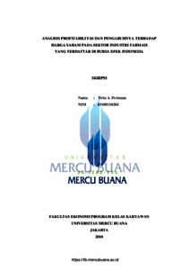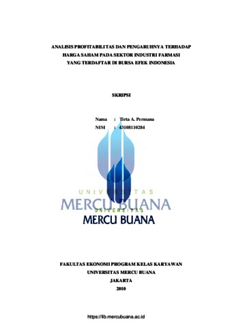Skripsi ini membahas bagaimana pengaruh dari Net Profit Margin (NPM), Return on Assets (ROA) dan Return on Equity (ROE), yang selanjutnya akan berdampak terhadap harga saham (Stock Price) pada sektor industri farmasi yang terdaftar di Bursa Efek Indonesia. Pengumpulan data dalam penelitian ini bersifat observasi non partisipasi, selama data yang digunakan adalah data sekunder berupa laporan keuangan publikasi dari perusahaan-perusahaan yang menjadi obyek dari penelitian yang terdaftar di Bursa Efek Indonesia. Pengumpulan data dilakukan dengan penelitian kepustakaan (library research) melalui kepustakaan dan media internet, sedangkan analisis yang digunakan dalam penelitian adalah regresi linier berganda dengan alat bantu program Statistical Product and Service Solution (SPSS) v.15. Dalam proses pengujian, variabel yang memenuhi syarat uji penyimpangan asumsi klasik adalah Net Profit Margin (NPM) dan Return on Equity (ROE). Hasil pengujian hipotesis menunjukkan bahwa terdapat pengaruh yang signifikan dari Net Profit Margin (NPM) dan Return on Equity (ROE) secara bersama-sama (simultan), terdapat pengaruh signinifikan dari NPM secara individu (parsial), dan tidak terdapat pengaruh signinifikan dari ROE secara individu (parsial) terhadap harga saham (Stock Price) pada sektor industri farmasi yang terdaftar di Bursa Efek Indonesia. Untuk penelitian selanjutnya disarankan untuk melakukan penelitian pada sektor industri selain farmasi, dengan lingkup penelitian diperluas. Kata kunci : Net Profit Margin (NPM), Return on Assets (ROA), Return on Equity (ROE), Harga Saham (Stock Price)