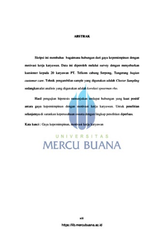 Skripsi ini membahas bagaimana hubungan dari gaya kepemimpinan dengan motivasi kerja karyawan. Data ini diperoleh melalui survey dengan menyebarkan kuesioner kepada 20 karyawan PT. Telkom cabang Serpong, Tangerang bagian customer care. Tehnik pengambilan sample yang digunakan adalah Cluster Sampling sedangkan alat analisis yang digunakan adalah korelasi spearman rho. Hasil pengujian hipotesis menunjukan terdapat hubungan yang kuat positif antara gaya kepemimpinan dengan motivasi kerja karyawan. Untuk penelitian selanjutnya di sarankan keperusahaan swasta dengan lingkup penelitian diperluas. Kata kunci : Gaya kepemimpinan, motivasi kerja karyawan