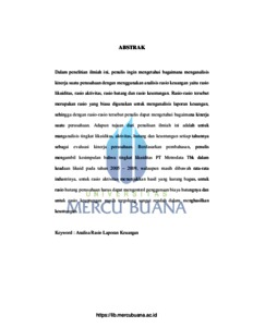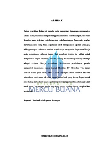 Dalam penelitian ilmiah ini, penulis ingin mengetahui bagaimana menganalisis kinerja suatu perusahaan dengan menggunakan analisis rasio keuangan yaitu rasio likuiditas, rasio aktivitas, rasio hutang dan rasio keuntungan. Rasio-rasio tersebut merupakan rasio yang biasa digunakan untuk menganalisis laporan keuangan, sehingga dengan rasio-rasio tersebut penulis dapat mengetahui bagaimana kinerja suatu perusahaan. Adapun tujuan dari penulisan ilmiah ini adalah untuk manganalisis tingkat likuiditas, aktivitas, hutang dan keuntungan setiap tahunnya sebagai evaluasi kinerja perusahaan. Berdasarkan pembahasan, penulis mengambil kesimpulan bahwa tingkat likuiditas PT Metrodata Tbk dalam keadaan likuid pada tahun 2005 – 2009, walaupun masih dibawah rata-rata industrinya, untuk rasio aktivitas menunjukkan hasil yang kurang bagus, untuk rasio hutang perusahaan harus dapat mengontrol penggunaan biaya hutangnya dan untuk rasio keuntungan masih tergolong sangat rendah dalam menghasilkan keuntungan. Keyword : Analisa Rasio Laporan Keuangan