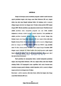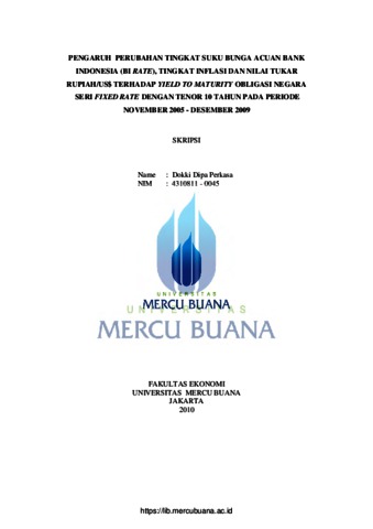 Perkasa, Dokki Dipa (2010) PENGARUH PERUBAHAN TINGKAT SUKU BUNGA ACUAN BANK INDONESIA (BI RATE), TINGKAT INFLASI DAN NILAI TUKAR RUPIAH/US$ TERHADAP YIELD TO MATURITY OBLIGASI NEGARA SERI FIXED RATE DENGAN TENOR 10 TAHUN PADA PERIODE NOVEMBER 2005 - DESEMBER 2009. S1 thesis, Universitas Mercu Buana.