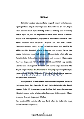 Skripsi ini bertujuan untuk membahas pengaruh variabel-varabel ekonomi seperti perubahan tingkat suku bunga acuan Bank Indonesia (BI rate), tingkat inflasi dan nilai tukar Rupiah terhadap Dollar AS terhadap yield to maturity obligasi negara seri fixed rate dengan tenor 10 tahun selama periode 2005 sampai dengan 2009. Metode penelitian yang digunakan metode kausal. Penelitian kausal adalah penelitian untuk mengetahui pengaruh satu atau lebih (variabel independen) terhadap variabel tertentu (variabel dependen). Jenis penelitian ini adalah penelitian kuantitatif dengan berdasarkan data sekunder berupa data bulanan tingkat suku bunga Bank Indonesia (BI rate), tingkat inflasi, nilai tukar Rupiah terhadap Dollar AS dan rata-rata bulanan yield to maturity obligasi negara fixed rate dengan seri FR0017, FR0018, FR0026 dan FR0027 yang memiliki tenor 10 tahun selama periode November 2005 sampai dengan Desember 2009 dengan sampel sebanyak 50. Teknis analisis data yang digunakan yaitu regresi linear berganda, pengujian asumsi klasik, pengujian hipotesis dengan uji t dan f dan uji koefisien determinasi. Hasil penelitian ini menunjukkan bahwa variabel independen perubahan tingkat suku bunga Bank Indonesia (BI rate), tingkat inflasi, nilai tukar Rupiah terhadap Dollar AS berpengaruh secara signifikan baik secara bersama-sama (simultan) maupun parsial terhadap variabel dependen yield to maturity obligasi negara seri fixed rate dengan tenor 10 tahun. Kata kunci : yield to maturity, nilai tukar (kurs), inflasi dan tingkat suku bunga acuan Bank Indonesia (BI rate).