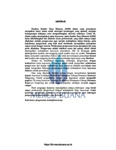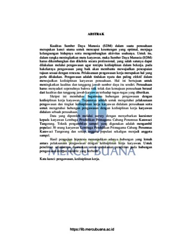 Kualitas Sumber Daya Manusia (SDM) dalam suatu perusahaan merupakan kunci utama untuk mencapai keuntungan yang optimal, menjaga kelangsungan hidupnya serta mengembangkan aktivitas usahanya. Untuk itu, dalam rangka meningkatkan mutu karyawan, maka Sumber Daya Manusia (SDM) harus dikembangkan dan dikelola secara professional, yang salah satunya dapat dilakukan melalui pengawasan agar tercipta kedisiplinan dalam bekerja. pada hakekatnya pengawasan yang baik akan membantu mewujudkan pencapaian tujuan sesuai dengan rencana. Pelaksanaan pengawasan kerja merupakan hal yang perlu dilakukan. Pengawasan adalah tindakan nyata dan paling efektif dalam mewujudkan kedisiplinan karyawan perusahaan. Hal ini bertujuan untuk meningkatkan kualitas dan tanggung jawab sumber daya itu sendiri. Perusahaan harus menyadari sepenuhnya bahwa titik tolak dan kemajuan perusahaan berasal dari kualitas dan tanggung jawab karyawan terhadap tugas-tugas yang diberikan. Skripsi ini membahas bagaimana hubungan pengawasan dengan kedisiplinan kerja karyawan. Tujuannya adalah untuk mengetahui pelaksanaan pengawasan dan tingkat kedisiplinan kerja karyawan didalam perusahaan serta untuk mengetahui hubungan pengawasan dengan kedisiplinan kerja karyawan didalam sebuah perusahaan. Data yang diperoleh melalui survey dengan menyebarkan kuesioner kepada karyawan Lembaga Pendidikan Primagama Cabang Perumnas Karawaci Tangerang. Teknik pengambilan sampel yang digunakan adalah mengambil populasi 30 orang karyawan Lembaga Pendidikan Primagama Cabang Perumnas Karawaci Tangerang dan setiap anggota populasi sekaligus menjadi anggota sampel. Hasil pengujian hipotesis menunjukkan adanya hubungan yang lemah antara pelaksanaan pengawasan dengan kedisiplinan kerja karyawan. Untuk penelitian selanjutnya disarankan untuk melakukan penelitian pada hubungan pengawasan dengan variable yang berbeda. Kata kunci: pengawasan, kedisiplinan kerja.