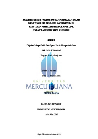 Ariesty, Ariesty (2010) ANALISIS FAKTOR-FAKTOR BAURAN PEMASARAN DALAM MEMPENGARUHI PERILAKU KONSUMEN PADA KEPUTUSAN PEMBELIAN PRODUK UNIT LINK PADA PT. ASURANSI JIWA SINARMAS. S1 thesis, Universitas Mercu Buana.
