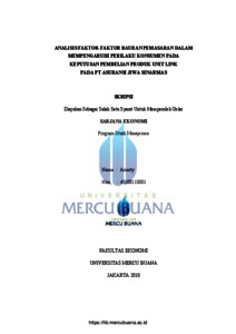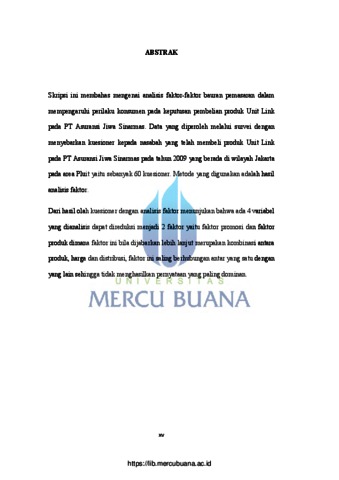 Skripsi ini membahas mengenai analisis faktor-faktor bauran pemasaran dalam mempengaruhi perilaku konsumen pada keputusan pembelian produk Unit Link pada PT Asuransi Jiwa Sinarmas. Data yang diperoleh melalui survei dengan menyebarkan kuesioner kepada nasabah yang telah membeli produk Unit Link pada PT Asuransi Jiwa Sinarmas pada tahun 2009 yang berada di wilayah Jakarta pada area Pluit yaitu sebanyak 60 kuesioner. Metode yang digunakan adalah hasil analisis faktor. Dari hasil olah kuesioner dengan analisis faktor menunjukan bahwa ada 4 variabel yang dianalisis dapat direduksi menjadi 2 faktor yaitu faktor promosi dan faktor produk dimana faktor ini bila dijabarkan lebih lanjut merupakan kombinasi antara produk, harga dan distribusi, faktor ini saling berhubungan antar yang satu dengan yang lain sehingga tidak menghasilkan pernyataan yang paling dominan.