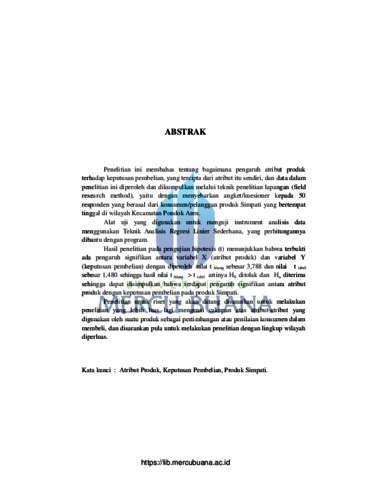 Penelitian ini membahas tentang bagaimana pengaruh atribut produk terhadap keputusan pembelian, yang tercipta dari atribut itu sendiri, dan data dalam penelitian ini diperoleh dan dikumpulkan melalui teknik penelitian lapangan (field research method), yaitu dengan menyebarkan angket/kuesioner kepada 50 responden yang berasal dari konsumen/pelanggan produk Simpati yang bertempat tinggal di wilayah Kecamatan Pondok Aren. Alat uji yang digunakan untuk menguji instrument analisis data menggunakan Teknik Analisis Regresi Linier Sederhana, yang perhitungannya dibantu dengan program. Hasil penelitian pada pengujian hipotesis (t) menunjukkan bahwa terbukti ada pengaruh signifikan antara variabel X (atribut produk) dan variabel Y (keputusan pembelian) dengan diperoleh nilai t hitung sebesar 3,788 dan nilai t tabel sebesar 1,480 sehingga hasil nilai t hitung > t tabel artinya H0 ditolak dan Ha diterima sehingga dapat disimpulkan bahwa terdapat pengaruh signifikan antara atribut produk dengan keputusan pembelian pada produk Simpati. Penelitian untuk riset yang akan datang disarankan untuk melakukan penelitian yang lebih luas lagi mengenai cakupan atas atribut-atribut yang digunakan oleh suatu produk sebagai pertimbangan atau penilaian konsumen dalam membeli, dan disarankan pula untuk melakukan penelitian dengan lingkup wilayah diperluas. Kata kunci : Atribut Produk, Keputusan Pembelian, Produk Simpati.