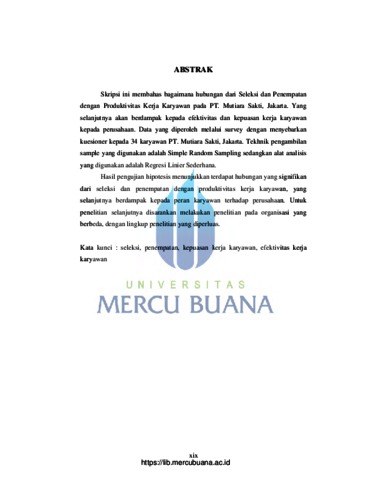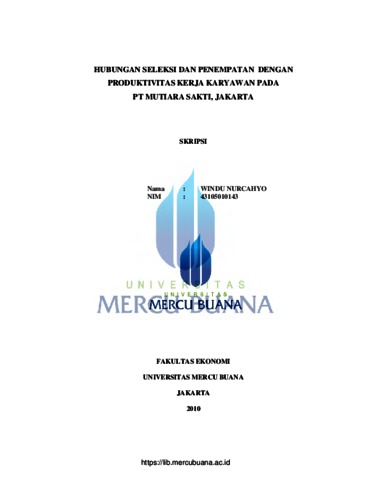 Nurcahyo, Windu (2010) HUBUNGAN SELEKSI DAN PENEMPATAN DENGAN PRODUKTIVITAS KERJA KARYAWAN PADA PT. MUTIARA SAKTI, JAKARTA. S1 thesis, Universitas Mercu Buana.