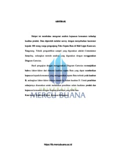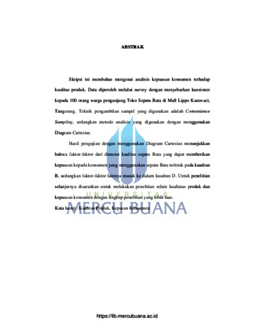 Skripsi ini membahas mengenai analisis kepuasan konsumen terhadap kualitas produk. Data diperoleh melalui survey dengan menyebarkan kuesioner kepada 100 orang warga pengunjung Toko Sepatu Bata di Mall Lippo Karawaci, Tangerang. Teknik pengambilan sampel yang digunakan adalah Convenience Sampling, sedangkan metode analisis yang digunakan dengan menggunakan Diagram Cartesius. Hasil pengujian dengan menggunakan Diagram Cartesius menunjukkan bahwa faktor-faktor dari dimensi kualitas sepatu Bata yang dapat memberikan kepuasan kepada konsumen yang menggunakan sepatu Bata terletak pada kuadran B, sedangkan faktor-faktor lainnya masuk ke dalam kuadran D. Untuk penelitian selanjutnya disarankan untuk melakukan penelitian selain kualiatas produk dan kepuasan konsumen dengan lingkup penelitian yang lebih luas. Kata kunci : Kualitas Produk, Kepusan Konsumen