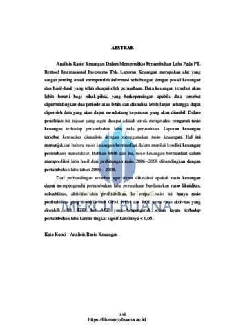 Rahim, Elisye Puspita (2010) ANALISIS RASIO KEUANGAN DALAM MEMPREDIKSI PERTUMBUHAN LABA PADA PT.BENTOEL INTERNASIONAL INVESTAMA TBK. S1 thesis, Universitas Mercu Buana.
