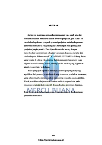 Skripsi ini membahas komunikasi pemasaran yang salah satu alat komunikasi dalam pemasaran adalah promosi penjualan, jadi skripsi ini membahas bagaimana pengaruh promosi penjualan terhadap keputusan pembelian konsumen, yang selanjutnya berdampak pada peningkatan penjualan jangka pendek. Data diperoleh melalui survey dengan menyebarkan kuesioner dan sebagian wawancara langsung melalui line telefon kepada 50 konsumen PT KIA MOBIL INDONESIA Cabang Tebet, yang berada di sekitar Jabodetabek. Teknik pengambilan sampel yang digunakan adalah rumus Slovin, sedangkan alat analisis yang digunakan adalah regresi linier sederhana. Hasil pengujian hipotesis menunjukkan terdapat pengaruh yang signifikan dari promosi penjualan terhadap keputusan pembelian konsumen, yang selanjutnya berdampak dalam mendorong penjualan jangka pendek. Untuk penelitian selanjutnya disarankan melakukan penelitian pada organisasi selain produk otomotif, dengan lingkup penelitian diperluas.. Kata Kunci : komunikasi pemasaran, promosi penjualan dan keputusan pembelian konsumen.