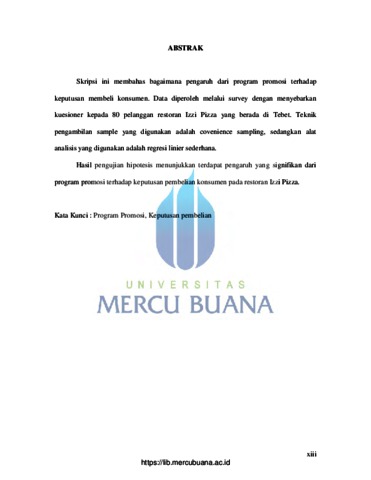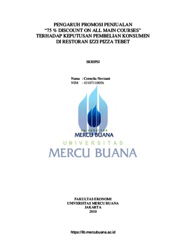 Novianti, Cornelia (2010) PENGARUH PROMOSI PENJUALAN "75% DISCOUNT ON ALL MAIN COURSES" TERHADAP KEPUTUSAN PEMBELIAN KONSUMEN DI RESTORAN IZZI PIZZA TEBET. S1 thesis, Universitas Mercu Buana.