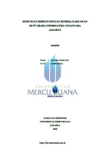 Sari, Jernitha Indah (2010) HUBUNGAN DISIPLIN DENGAN KINERJA KARYAWAN DI PT GRAHA INFORMATIKA NUSANTARA JAKARTA. S1 thesis, Universitas Mercu Buana.
