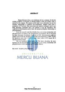 Human Resources has a very dominant role in a company. So that the existing workforce is necessary to develop quality so that can achieve what is desired by the company. The purpose of this study was to determine how far the dicipline relationships to employee job performance. Samples taken from a population of 57 persons. Data processing and analysis techniques used to use Rank Spearman correlation and t test statistics to test the hypothesis. The coefficient of determination used to know the amount of dicipline relationships to job performance. From the research result that dicipline has a very strong relationship with job performance according to the interpretation of correlation. This is seen from the Rank Spearman Correlation Coefficient of 0.83. Determination coefficient analysis showed that the dicipline of work affect the performance of 69%. Testing the hypothesis states that t (11.03) is bigger than t table (1.671) means Ho is rejected and Hi accepted. This the hypothesis raised author of "The better discipline, the more increase also the job performance." dicipline has a very strong relationship with job performance on the employees of PT Gratika, Jakarta. Key words : dicipline, job performance