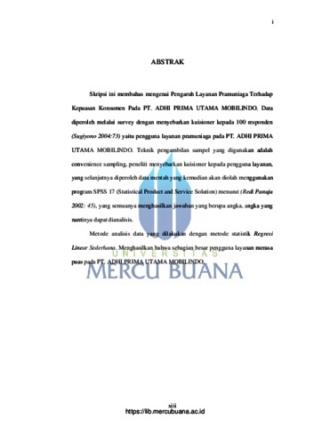 Skripsi ini membahas mengenai Pengaruh Layanan Pramuniaga Terhadap Kepuasan Konsumen Pada PT. ADHI PRIMA UTAMA MOBILINDO. Data diperoleh melalui survey dengan menyebarkan kuisioner kepada 100 responden (Sugiyono 2004:73) yaitu pengguna layanan pramuniaga pada PT. ADHI PRIMA UTAMA MOBILINDO. Teknik pengambilan sampel yang digunakan adalah convenience sampling, peneliti menyebarkan kuisioner kepada pengguna layanan, yang selanjutnya diperoleh data mentah yang kemudian akan diolah menggunakan program SPSS 17 (Statistical Product and Service Solution) menurut (Redi Panuju 2002: 45), yang semuanya menghasilkan jawaban yang berupa angka, angka yang nantinya dapat dianalisis. Metode analisis data yang dilakukan dengan metode statistik Regresi Linear Sederhana. Menghasilkan bahwa sebagian besar pengguna layanan merasa puas pada PT. ADHI PRIMA UTAMA MOBILINDO.
