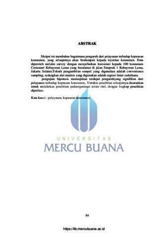 Skripsi ini membahas bagaimana pengaruh dari pelayanan terhadap kepuasan konsumen, yang selanjutnya akan berdampak kepada loyalitas konsumen. Data diperoleh melalui survey dengan menyebarkan kuesioner kepada 100 konsumen Ceriamart Kebayoran Lama yang beralamat di jalan Simpruk 1 Kebayoran Lama, Jakarta Selatan.Teknik pengambilan sempel yang digunakan adalah convenience sampling, sedangkan alat analisis yang digunakan adalah regresi linier sederhana. pengujian hipotesis menunjukan terdapat pengaruhyang signifikan dari pelayanan terhadap kepuasan konsumen,. Untukm penelitian selanjutnya disarankan untuk melakukan penelitian padaorganisaai selain ritel, dengan lingkup penelitian diperluas. Kata kunci : pelayanan, kepuasan konsumen.