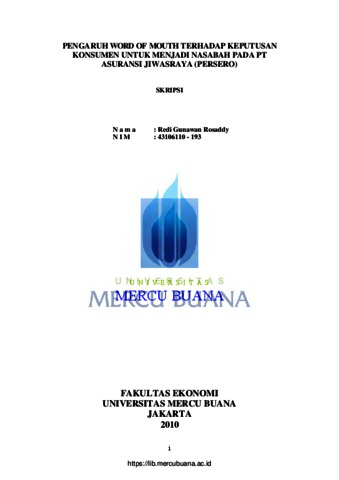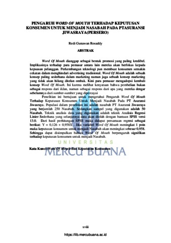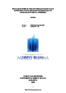 Rosaddy, Redi Gunawan (2010) PENGARUH WORD OF MOUTH TERHADAP KEPUTUSAN KONSUMEN UNTUK MENJADI NASABAH PADA PT.ASURANSI JIWASRAYA (PERSERO). S1 thesis, Universitas Mercu Buana.