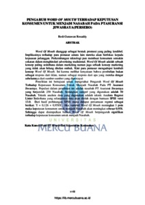 Word Of Mouth dianggap sebagai bentuk promosi yang paling kredibel. Implikasinya terhadap para pemasar antara lain mereka akan berfokus kepada kepuasan pelanggan. Perkembangan teknologi pun membuat konsumen semakin cekatan dalam menghindari advertising tradisional. Word Of Mouth adalah sebuah konsep paling sederhana dalam marketing namun juga sebuah konsep marketing yang tidak akan hilang ditelan ombak. Kini para pemasar mengadopsi kembali konsep Word Of Mouth. Ini karena melihat kenyataan bahwa pembelian bukan sebagai respons dari iklan, namun sebagai respons dari apa yang mereka dengar sebelumnya dari sumber-sumber yang dipercayai Penelitian ini bertujuan untuk mengetahui Pengaruh Word Of Mouth Terhadap Keputusan Konsumen Untuk Menjadi Nasabah Pada PT Asuransi Jiwasraya. Populasi dalam penelitian ini adalah nasabah PT Asuransi Jiwasraya yang berjumlah 250 Nasabah. Sedangkan sampel yang digunakan adalah 50 Nasabah. Teknik analisis data yang digunakan adalah teknik Analisis Regresi Linier Sederhana yang selanjutnya data akan diolah dengan bantuan SPSS versi 13.0. Dari hasil perhitungan SPSS maka didapat persamaan regresi sebagai berikut: Y = 0,126 + 0,958X . Jika variabel Word Of Mouth meningkat 1 poin maka keputusan konsumen untuk menjadi Nasabah akan meningkat sebesar 0,958. Sehingga dapat disimpulkan bahwa Word Of Mouth berpengaruh signifikan terhadap keputusan konsumen untuk menjadi Nasabah. Kata Kunci:Word Of Mouth dan Keputusan Konsumen