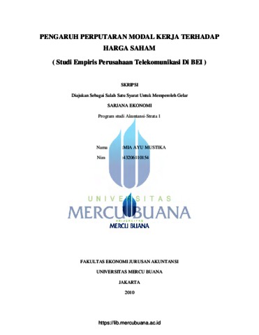 Mustika, Mia Ayu (2010) PENGARUH PERPUTARAN MODAL KERJA TERHADAP HARGA SAHAM (Studi Empiris Perusahaan Telekomunikasi di BEI). S1 thesis, Universitas Mercu Buana.
