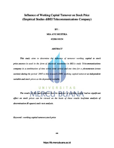This study aims to determine the influence of turnover working capital to stock price.sources is used in the form of financial statements in BEI.is study Telecommunications company is a combination of time series (time series) and one time for a phenomenon (croos section) during the period 2005 to this research 2009. working capital turnover as independent variable and stock prices as the dependent variable. The results of this study indicate that the turnover of working capital had no significant effect on stock prices can be viewed on the basis of these results koefisian analysis of determination (R square) and t-test analysis. Keyword : working capital turnover,stock price