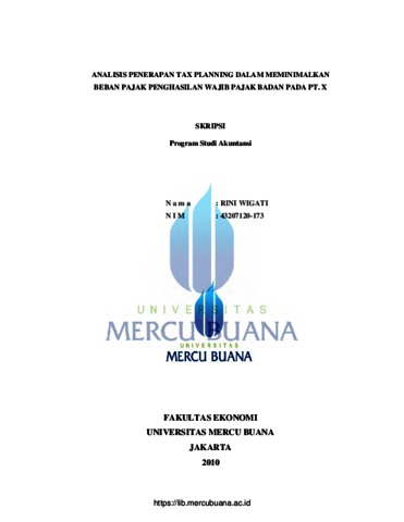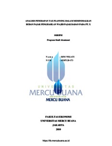 wigati, Rini (2010) ANALISIS PENERAPAN TAX PLANNING DALAM MEMINIMALKAN BEBAN PAJAK PENGHASILAN WAJIB PAJAK BADAN PADA PT. X. S1 thesis, Universitas Mercu Buana.