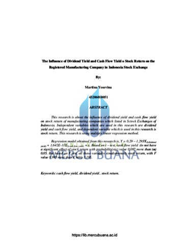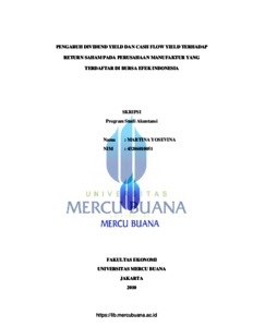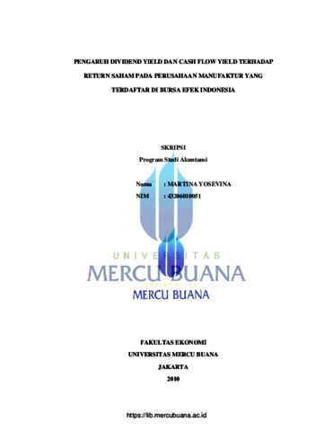Yosevina, Martina (2010) PENGARUH DEVIDEND YIELD DAN CASH FLOW YIELD TERHADAP RETURN SAHAM PADA PERUSAHAAN MANUFAKTUR YANG TERDAFTAR DI BURSA EFEK INDONESIA. S1 thesis, Universitas Mercu Buana.