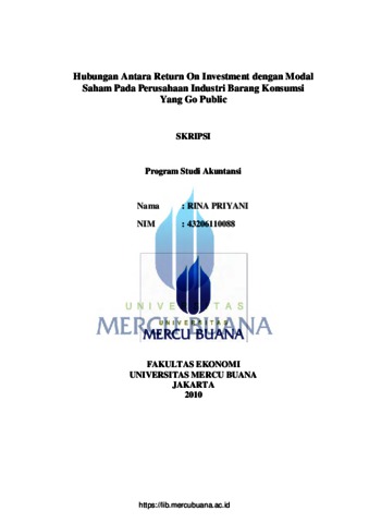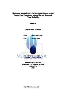 Priyani, Rina (2010) HUBUNGAN ANTARA RETURN ON INVESTMENT DENGAN MODAL SAHAM PADA PERUSAHAAN INDUSTRI BARANG KONSUMSI YANG GO PUBLIC. S1 thesis, Universitas Mercu Buana.