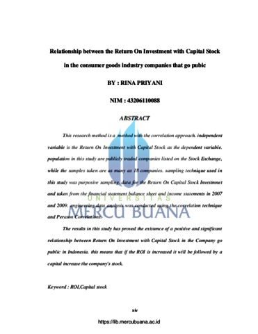 This research method is a method with the correlation approach. independent variable is the Return On Investment with Capital Stock as the dependent variable. population in this study are publicly traded companies listed on the Stock Exchange, while the samples taken are as many as 18 companies. sampling technique used in this study was purposive sampling. data for the Return On Capital Stock Investmnet and taken from the financial statement balance sheet and income statements in 2007 and 2009. engineering data analysis was conducted using the correlation technique and Perason Correlations. The results in this study has proved the existence of a positive and significant relationship between Return On Investment with Capital Stock in the Company go public in Indonesia. this means that if the ROI is increased it will be followed by a capital increase the company's stock. Keyword : ROI,Capital stock