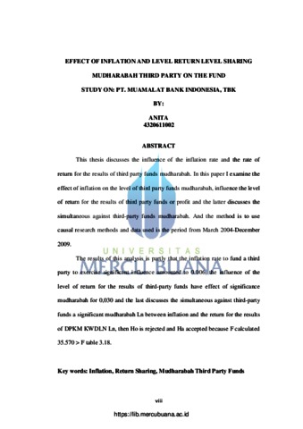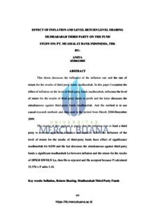 This thesis discusses the influence of the inflation rate and the rate of return for the results of third party funds mudharabah. In this paper I examine the effect of inflation on the level of third party funds mudharabah, influence the level of return for the results of third party funds or profit and the latter discusses the simultaneous against third-party funds mudharabah. And the method is to use causal research methods and data used is the period from March 2004-December 2009. The results of this analysis is partly that the inflation rate to fund a third party to exercise significant influence amounted to 0.006, the influence of the level of return for the results of third-party funds have effect of significance mudharabah for 0,030 and the last discusses the simultaneous against third-party funds a significant mudharabah Ln between inflation and the return for the results of DPKM KWDLN Ln, then Ho is rejected and Ha accepted because F calculated 35.570 > F table 3.18. Key words: Inflation, Return Sharing, Mudharabah Third Party Funds