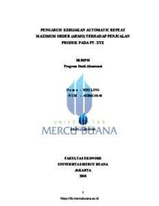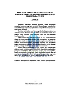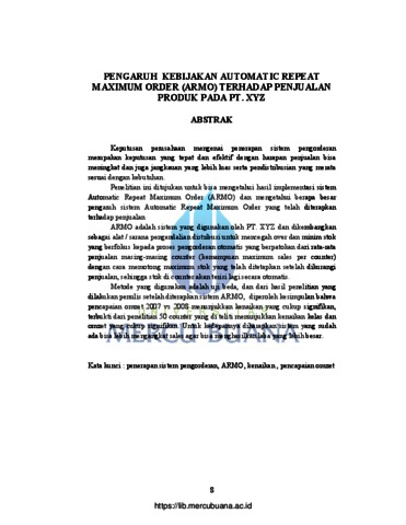 Ling, Mei (2010) PENGARUH KEBIJAKAN AUTOMATIC REPEAT MAXIMUM ORDER (ARMO) TERHADAP PENJUALAN PRODUK PADA PT.XYZ. S1 thesis, Universitas Mercu Buana.
