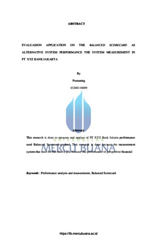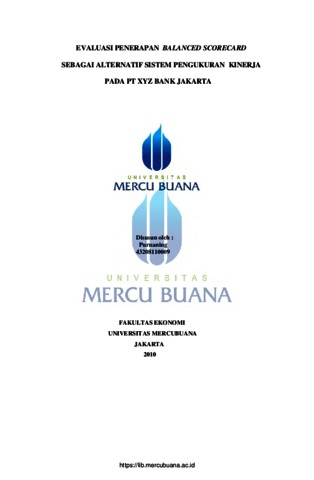 Purnaning, Purnaning (2010) EVALUASI PENERAPAN BALANCED SCORECARD SEBAGAI ALTERNATIF SISTEM PENGUKURAN KINERJA PADA PT. XYZ BANK JAKARTA. S1 thesis, Universitas Mercu Buana.