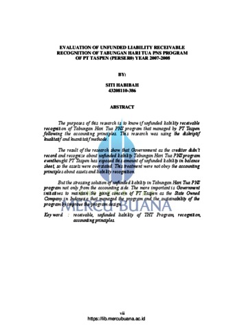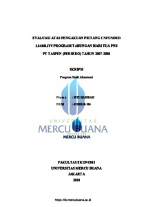 Habibah, Siti (2010) EVALUASI ATAS PENGAKUAN PIUTANG UNFUNDED LIABILITY PROGRAM TABUNGAN HARI TUA PNS PT.TASPEN (PERSERO) TAHUN 2007-2008. S1 thesis, Universitas Mercu Buana.