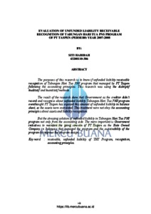 The purposes of this research is to know if unfunded liability receivable recognition of Tabungan Hari Tua PNS program that managed by PT Taspen following the accounting principles. This research was using the diskriptif kualitatif and kuantitatif methode. The result of the research show that Governmnent as the creditor didn’t record and recognize about unfunded liability Tabungan Hari Tua PNS program eventhought PT Taspen has exposed this amount of unfunded liability in balance sheet, so the assets were overstated. This treatment were not obey the accounting principles about assets and liability recognition. But the stressing solution of unfunded liability in Tabungan Hari Tua PNS program not only from the accounting side. The more important is Government initiatives to maintain the going concern of PT Taspen as the State Owned Company in Indonesia that managed the program and the sustainability of the program by improve the program design. Key word : receivable, unfunded liability of THT Program, recognition, accounting principles.
