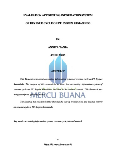 This Research was about accounting information system of revenue cycle on PT. Syspex Kemasindo. The purpose of this research is to know how accounting information system of revenue cycle on PT. Syspex Kemasindo and how is the internal control. This Research was using descriptive qualitatif method. The result of this research will be showing the way of revenue cycle and internal control on revenue cycle in PT. Syspex Kemasindo. Key words: accounting information system, revenue cycle, internal control.
