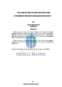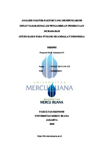 Setyawati, Vicky (2010) ANALISIS FAKTOR-FAKTOR YANG MEMPENGARUHI MINAT NASABAH PENGAMBILAN PEMBIAYAAN MURABAHAH (Studi Kasus Pada PT Bank Muamalat Indonesia). S1 thesis, Universitas Mercu Buana.