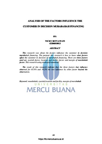 This research was about the factors influence the customer in decision murabahah financing. The purpose this research is how to know what factors affect the customer in decision of murabahah financing. There are three factors used are syariah factor, location and facility factor and margin of murabahah factor. This research using deskriptif kuantitatif. The result of this research indicate that the three factors that influence observed for 65.8% and 34.2% the rest influence by other factor beyond the observation. Keyword: murabahah, syariah,location and facility, margin of murabahah