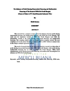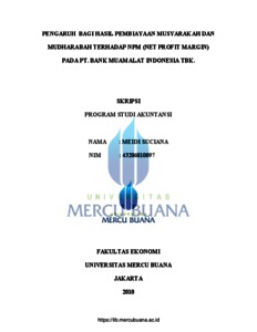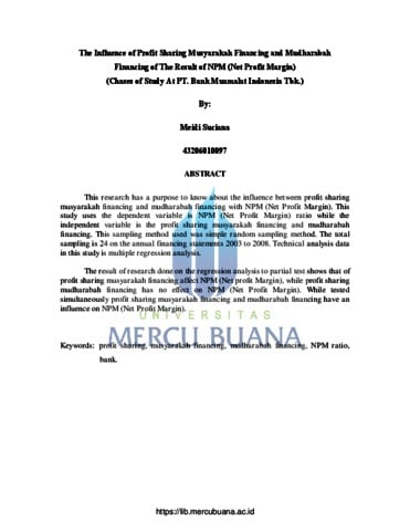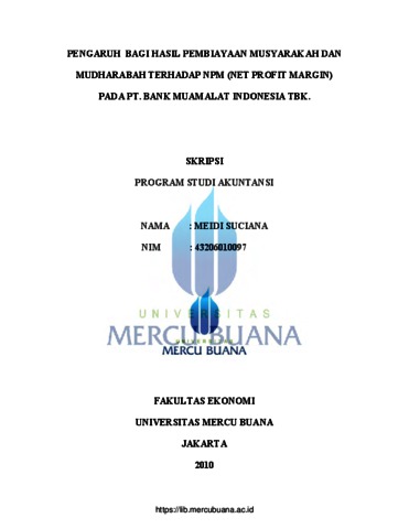 Suciana, Meidi (2010) PENGARUH BAGI HASIL PEMBIAYAAN MUSYARAKAH DAN MUDHARABAH TERHADAP NPM (net profit margin) PADA PT. BANK MUAMALAT INDONESIA TBK. S1 thesis, Universitas Mercu Buana.